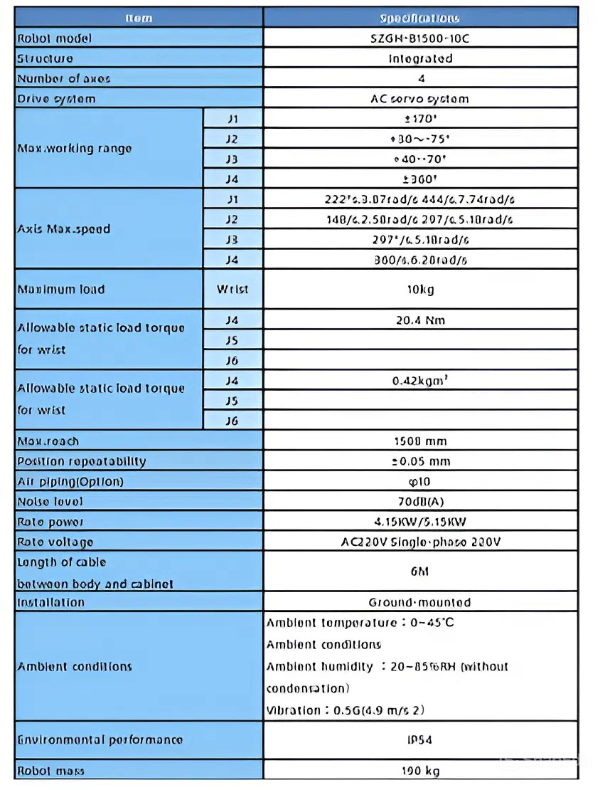 Robot SZGH-B1500-10C có kết cấu chắc chắn, khả năng vận hành linh hoạt và độ ổn định cao, phù hợp với nhiều dây chuyền sản xuất trong ngành cơ khí chế tạo, gia công kim loại và tự động hóa công nghiệp.