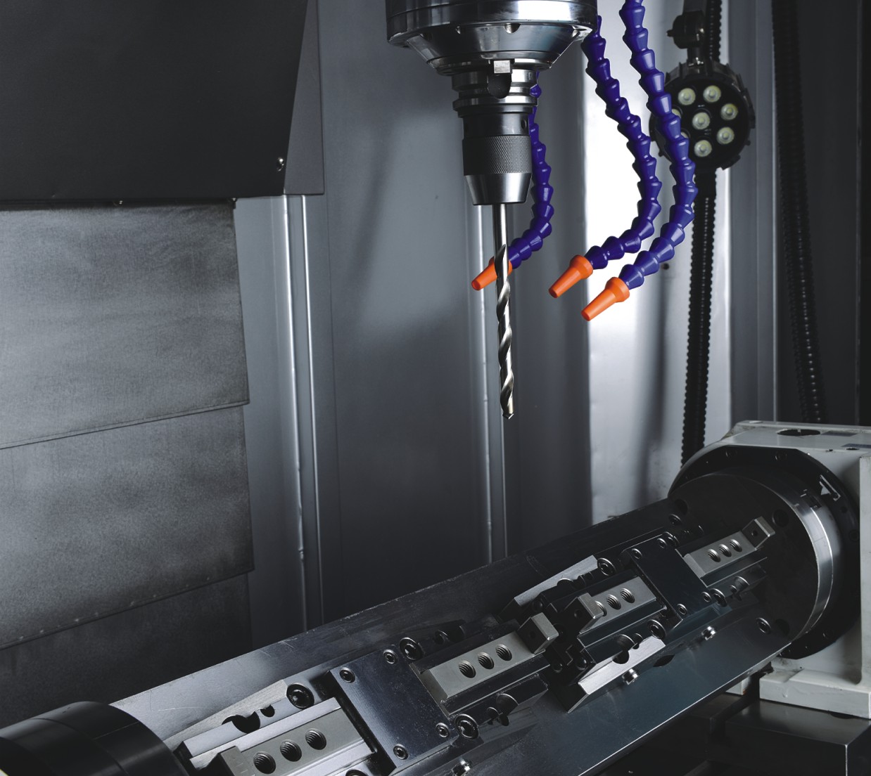 Hành trình trục Y: 550mm Hành trình trục Z: 550mm Trục X/Y/Z nhanh di chuyển: 48m/48m/48m/phút. Mũi trục chính tới bàn máy: 130-680mm Tâm trục chính đến cột: 570mm Loại đường dẫn: LM(Con lăn) |