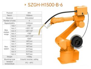 Robot hàn công nghiệp 6 trục SZGH-H1500-B-6 có tầm với 1500mm, tải trọng 6kg, độ chính xác cao, phù hợp cho dây chuyền hàn kim loại và tự động hóa sản xuất trong nhà máy.